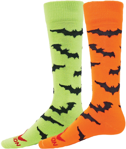 BLACK BATS HALLOWEEN SOCKS - You’ll scare everyone by wearing these fun Black Flying Bats Over the Calf Knee-High Socks made by Red Lion. These Black Bats Tube Socks are available in Bright Neon Orange or Bright Florescent Green, they feature lots of Flying Bats all around the sock, Sewn-in Heel construction with a cushioned sole and foot which provide lots of comfort and durability.