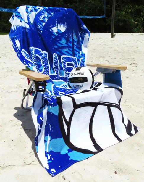 This big & soft 100% Cotton VOLLEYBALL BEACH TOWEL in a bright neon blue tropical volleyball design really stands out and is perfect for sprawling out on the beach or on the grass when playing outdoor volleyball; while hanging out at the pool; or when you're camping out at those weekend indoor volleyball tournaments.