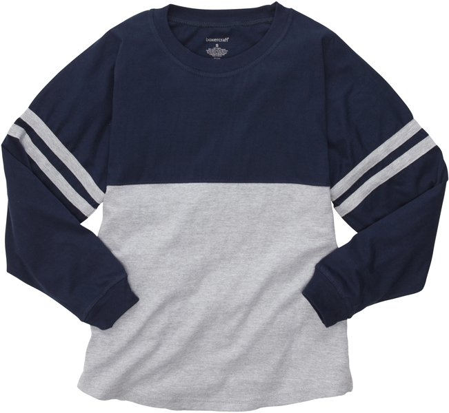 Stylish Boxercraft Brand Navy Blue & Oxford Grey Color-Block Oversized Athletic Pom Pom Game Day Jersey Shirts feature premium cotton for softness & comfort, and the option of VOLLEYBALL lettering printed across the back shoulder. With a comfortable crew neckline and an over-sized athletic shoulder, these long sleeve Game Day Jersey Pullover Tees will become your favorite sweatshirt.