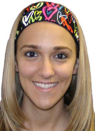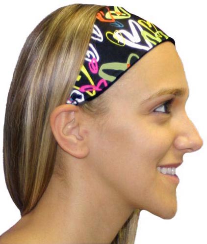 Fun Multi-Color Hearts Spandex Head Bands are composed of an 80% polyester / 20% lycra spandex blend fabric with a black jersey fabric interior lining and an elastic band in the back to help them stay in place. This Performance Activewear fabric is Moisture Wicking, Antibacterial, UV protected, and offers a 4-way Stretch for optimal comfort and durability.
