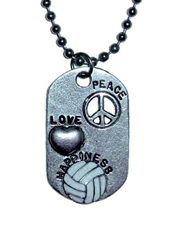 This cool Volleyball Dog-Tag Necklace measures 1-1/4" in length, and features the Peace, Love, Heart & Happiness symbols with a 3-D White Enamel Volleyball... all on an 18" Ball Chain Necklace. Please Note: Limited Quantities Available. Clearance Merchandise Is Non-Returnable.SCROLL DOWN TO ORDER A GIFT BOX FOR THIS ITEM...