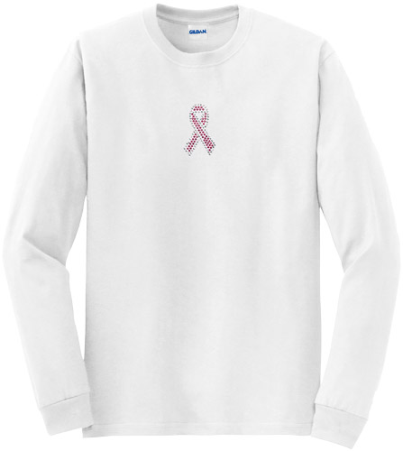 * Pink Ribbon design can be printed either centered (as shown in photo), or over the left chest. Please make sure to choose the ribbon placement you would like.These Colorful Pink Ribbon Cancer Awareness Rhinestone Shirts are decorated with Pink and Silver Rhinestones on the Front of the Long Sleeve Shirt.