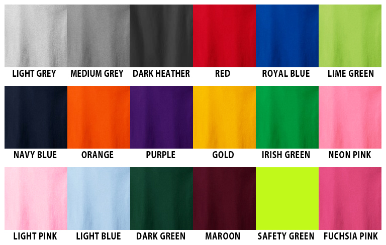 20 Colors: White, Black, Light Grey, Medium Grey, Dark Heather Grey, Red, Royal Blue, Lime Green, Navy Blue, Orange, Purple, Gold, Irish Green, Neon Pink, Light Pink, Light Blue, Dark Green, Maroon, Safety Green, and Fuchsia Pink.