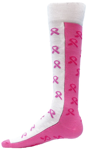 SISTERS HALF AND HALF PINK RIBBON SOCKS ... These Half and Half Pink Ribbon Socks not only look great, but support a great cause, and will make a statement every time you wear them. These Red Lion Brand Sisters Pink Ribbon Over the Calf Socks feature lots of Sewn-in Pink Ribbons going all the way around the sock, and have a Sewn-in Heel construction with a cushioned sole and foot which provide lots of comfort and durability.