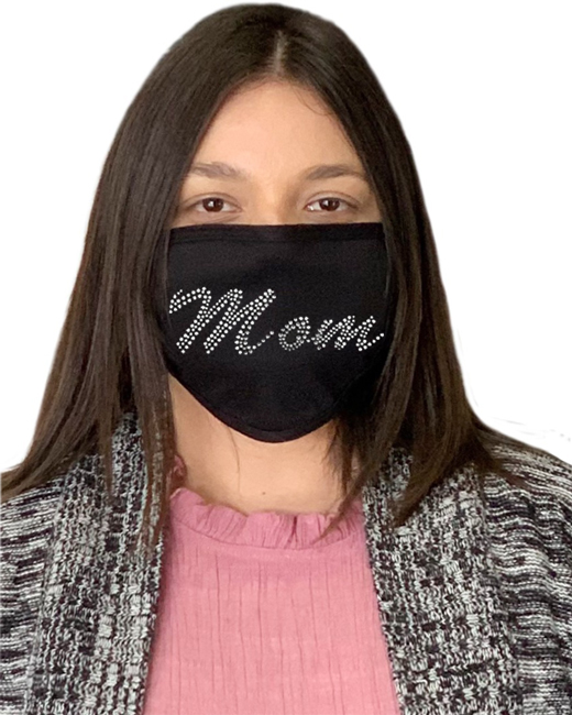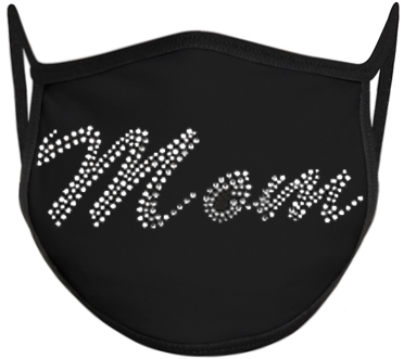 Sportsman Brand VC19 ValuMask Comfort Face Masks in Fun 3D Studded Be-Jeweled Rhinestone Mom Script Font Bling Sparkle Design in your Choice of Ear Loop Style and 6 Face Mask Colors.