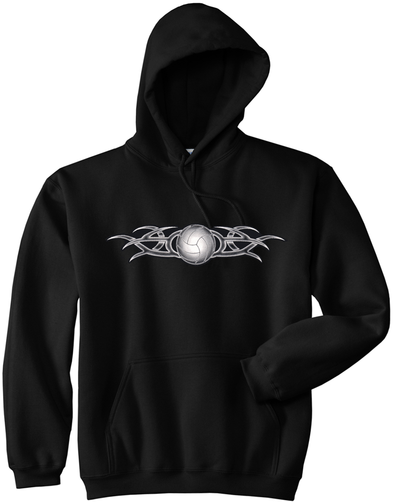Volleyball Tribal Tattoo Hoodie offers a Cool & Retro Tribal Tattoo Design with a Volleyball in the Center and a Tribal-Band Design on each side (see Photo above for closer detail).