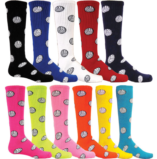Volleyball Logo Sock Colors: (shown above - Left to Right) • Black w/ White Volleyballs, • Royal Blue w/ White Volleyballs, • White w/ White Volleyballs, • Red w/ White Volleyballs, • Navy Blue w/ White Volleyballs, • Hot Pink w/ White Volleyballs, • Lime Green w/ White Volleyballs, • Pink w/ White Volleyballs, • Bright Orange w/ White Volleyballs (See Item # SO-7636C for Orange Socks), • Bright Yellow w/ White Volleyballs, • Turquoise Blue w/ White Volleyballs.