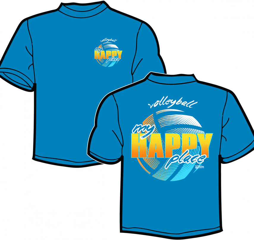 VOLLEYBALL MY HAPPY PLACE Iris Blue Volleyball Tee Shirt from Tandem Sport features both a front and a back design with bright & colorful volleyball graphics. The front design features a small but very bright volleyball design with the words Volleyball my HAPPY place, and the back of the shirt has a much larger volleyball graphic with the same bright design and words which are on the front logo. A very Bright & Fun Volleyball Shirt which is sure to be a hit with players of all ages.