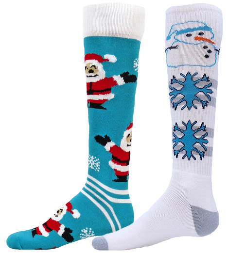 SANTA AND SNOWMAN SOCKS ... Look good while it's cold out and show your love of all things winter with these fun Snowman and Santa Over the Calf Knee-High Socks. Red Lion Brand Santa Socks feature lots of Santas and Snowflakes going all around the socks. The Snowman Socks feature big Snowflakes on both sides of the sock with large Snowmen at the top. Both socks feature a Sewn-in Heel construction with a cushioned sole and foot which provide lots of comfort and durability. These socks are long and stretchy. * * * The Size Small Snowman sock only has one set of snowflakes, the Size Medium sock (pictured above) has two sets of snowflakes.